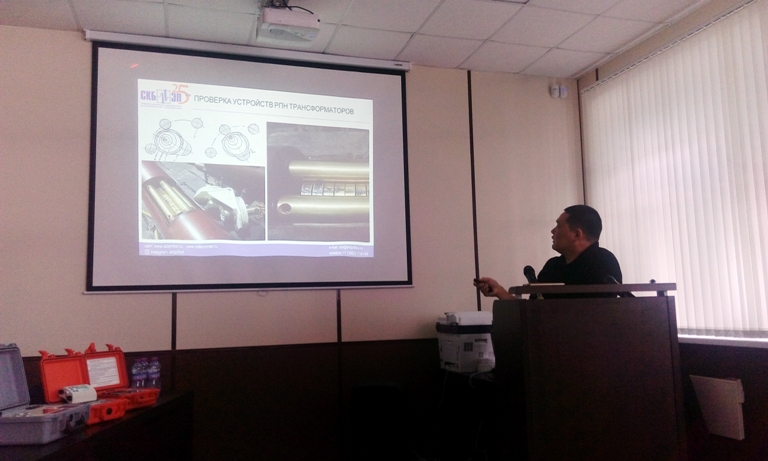 The next subject of the lecture course was devoted to diagnosis of OLTC devices of RS-3/RS-4, RNOA, and RNT-13 types. The matter is that the OLTC device is a rather important node in the power transformer, and the major share of failures falls on this very mechanism. The main problem is that the device is placed in a closed tank and repairmen have no possibility to visually control it, therefore, special equipment for non-destructive control of OLTC would considerably reduce labor intensity and costs. For solving this problem the SKB EP Company has designed a special-purpose PKR-2M analyzer and MIKO-8 and MIKO-9 milliohmmeters.