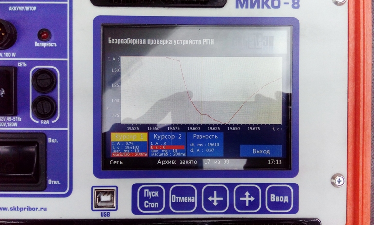 It should be noted that PKV/M7 analyzer has an in-built switch for setting both the simple operations and complex cycles of circuit-breakers for current of up to 14A for AC and DC drives. PKV/M6N automatically recognizes the type of a simple operation or a complex cycle but for their setting a special control unit out of PUV-type devices is needed. Control panel of dispatcher’s station can also be used. For the purpose of training the PKV/M6N device was completed with a PUV-controller for controlling the drives of HV circuit breakers and for checking the minimum voltage of circuit breaker coils operation according to RD 34.45-51.300-97.