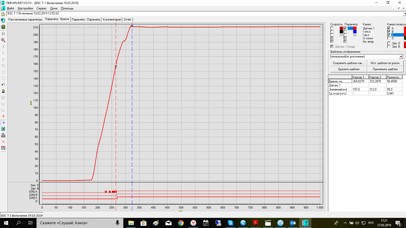 In order to assess the state of high-voltage circuit breaker, several tests were carried out with PKV/M7 and PKV/M6N instruments. Time and travel characteristics were measured on VMG-10 circuit breaker with PKV/M7 instrument (see Fig. 1 and Fig. 2). Conducting of these tests showed that the circuit breaker is fully consistent with its passport data.