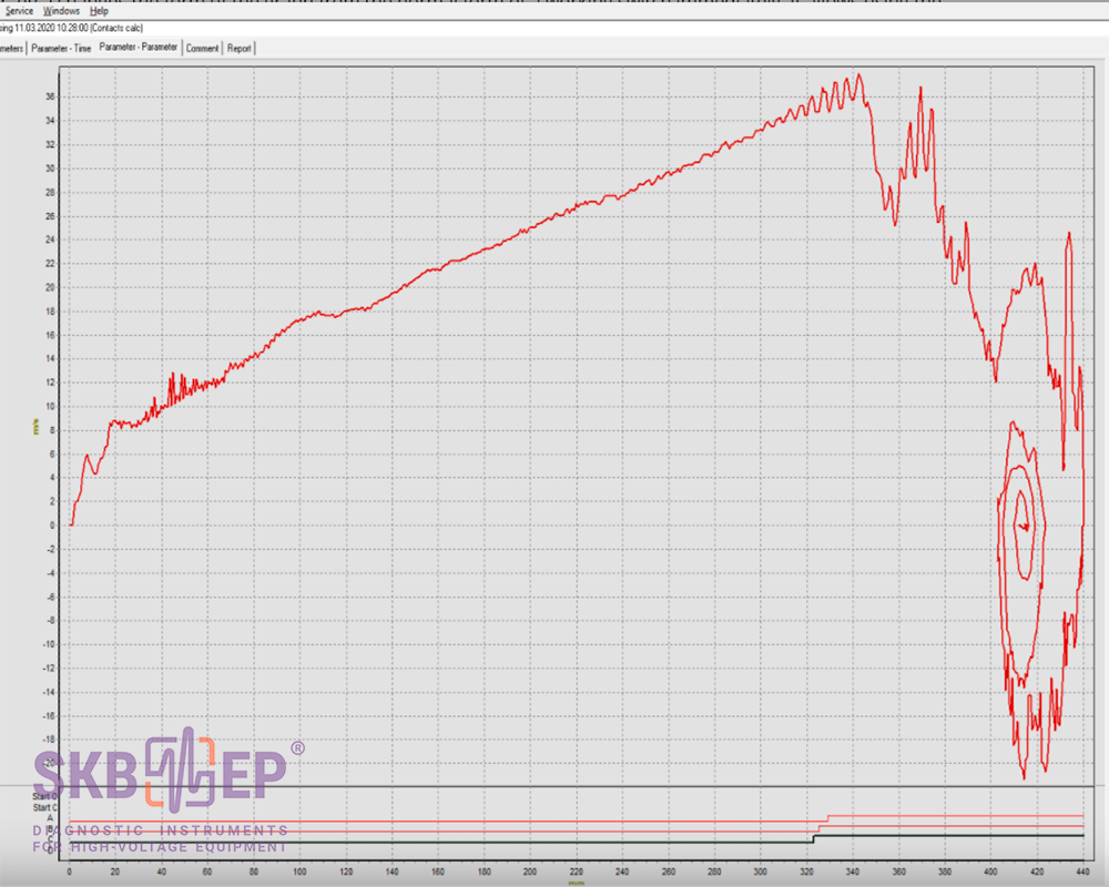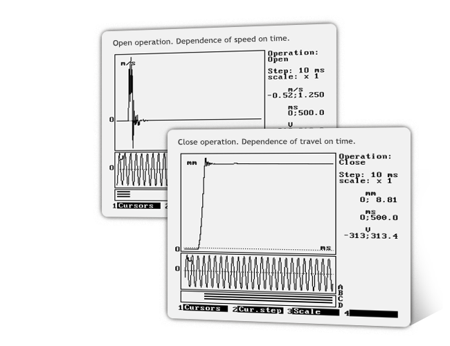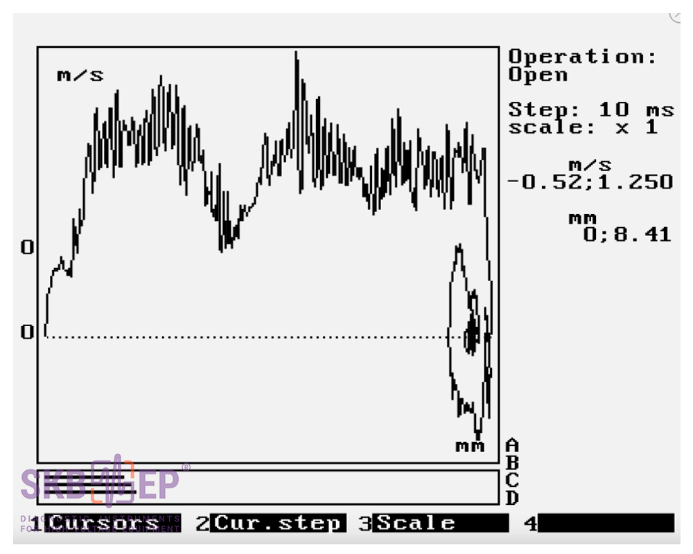 图形的类型由控制断路器触点闭合/打开的机构的运动链的所有链节(杠杆,弹簧,杆,轴,横移,阻尼器等)的状态决定。并且至少在其中一个环节中发生故障(增加运行,弹簧松动,摩擦增加,阻尼器故障等)立即改变图形的形式,从正常工作断路器的正常形式。它允许通过使用不可拆卸的方法在早期阶段识别其当前或早期故障。