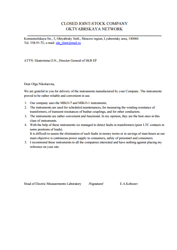 Our company uses the MIKO-7 and MIKO-1 instruments. The instruments are used for scheduled maintenances, for measuring the winding resistance of transformers, of transient resistances of busbar couplings, and for other conductors.