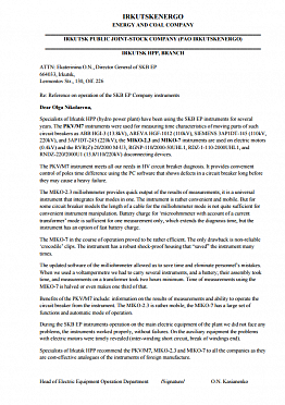 Specialists of Irkutsk HPP (hydro power plant) have been using the SKB EP instruments for several years. The PKV/M7 instruments were used for measuring time characteristics of moving parts of such circuit breakers as ABB HGI-3 (13.8kV), AREVA HGF-1012 (110kV), SIEMENS 3AP1DT-145 (110kV, 220kV), and 3AP1DT-245 (220kV); the MIKO-2.3 and MIKO-7 instruments are used on electric motors (0.4kV) and the RVR(Z)-20/2000 M-U3, RGNP-110/2000-50UHL1, RDZ-1-110-2000UHL1, and RNDZ-220/2000U1 (13.8/110/220kV) disconnecting devices.