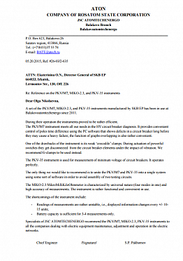 Specialists of JSC ATOMTECHENERGO recommend the PKV/M7, MIKO-2.3, PKV-35 instruments to all the companies dealing with electric equipment maintenance, adjustment and operation in the electric networks.