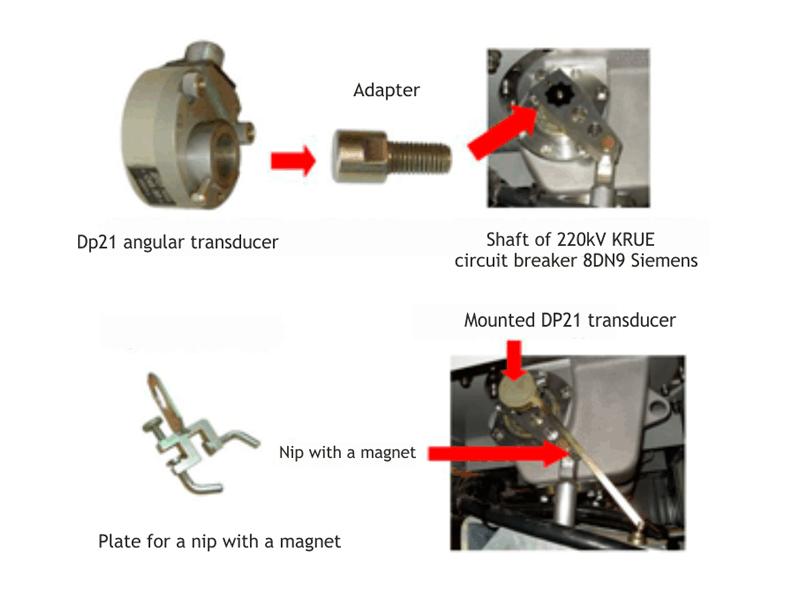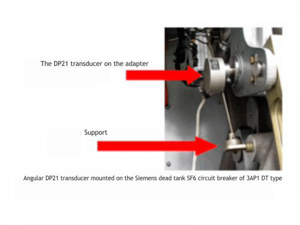 For control of the Siemens dead tank SF6 circuit breakers of 3AP1 DT type, the DP21 transducer is mounted on the adapter. Manufacturer has provided the M8 threaded connection in the drive shaft. An adapter in screwed into this hole. A nip of a transducer is fastened to a special support.
