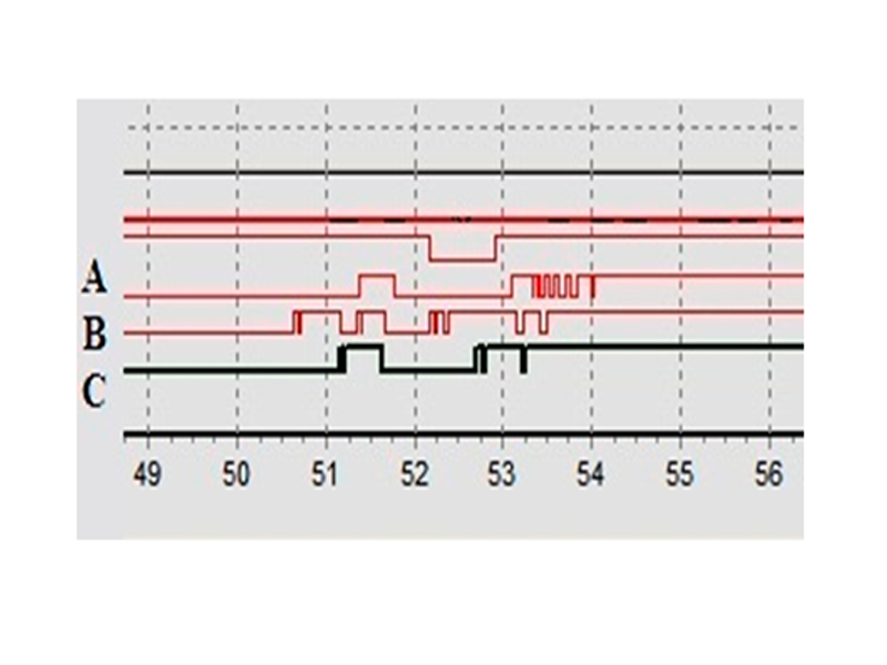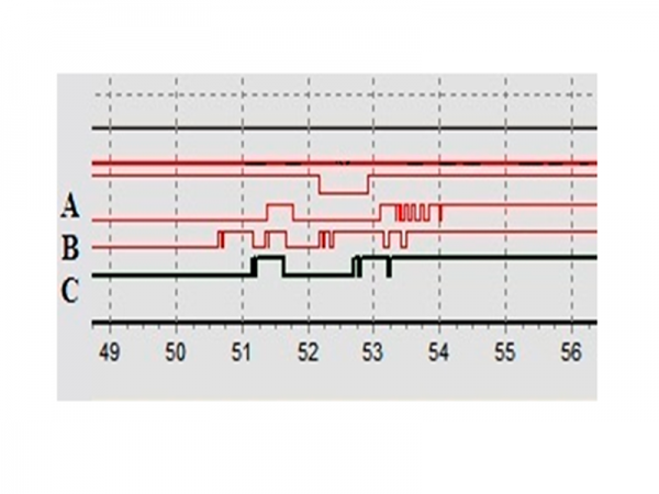 Operation of arch-extinction contacts is another parameter of a circuit breaker that can be estimated using the graph. Fig. 2 shows dependence of contacts status across all the three poles on the travel, where lower position corresponds to the OPEN status and the upper one to the CLOSE status. Difference in actuation and 'chatter' of contacts are obvious. The 'chatter' is mainly due to the fact that the arch-extinction contact is displaced from the lamel center and bounces back from the surface at the first touch. Difference in contacts operation across poles between the first closed contact B and the last contact A makes less than 1 ms, which is within tolerances for such types of HV circuit breakers.