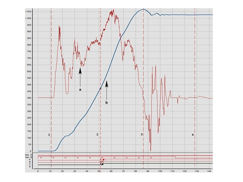 Let us consider operation of the SF6 circuit breaker triggering (of foreign manufacture). Curve 'a' in Fig. 1 (blue one) represents the travel vs time dependence of moving elements; curve 'b' (red one) shows speed vs time dependence. Behavior of a travel curve does not show any problems in the triggering process. Overlapping the speed vs time curve and a travel curve reveals some sections that are worth attention.