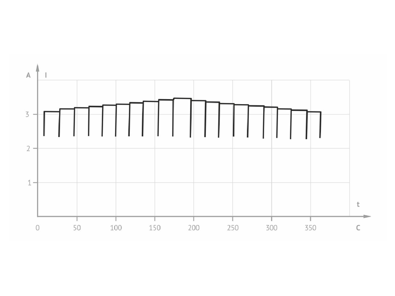 Each step of current change on the oscillogram reflects selector switch-over to the next lead. The step value is determined by a sum of the following resistances: winding resistance on the lead, selector and contactor contacts resistance. Short pulses between adjacent steps are a consequence of current-limiting resistors switch-over by a contactor. A close-up picture of one of such pulses is given in Fig. 3b. It looks like an oscillogram of contactor switch-over that is distorted by the winding inductance.