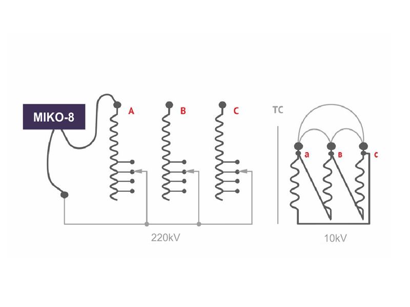 Non-destructive testing procedure is based on the DRM-method (direct resistance measurement) and consists in measuring the current value via the winding connected to LTC during its switch-over from a lead to a lead. Constant voltage is supplied from the MIKO-8 output to the input of an indicated winding, and secondary transformer windings are short-circuited (Figs. 1 & 2).