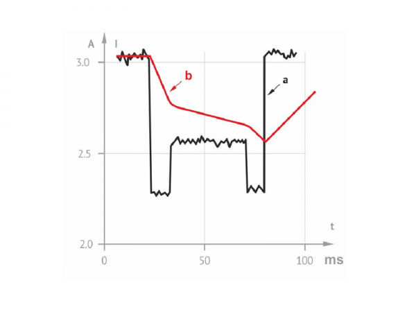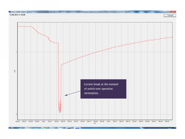 Fig. 6 shows a photo of a current graph of a faulty LTC that is displayed by a data viewer program of MIKO-8 on the PC display. Current interruption of approximately 5 ms that occurred at the moment of switch-over termination is very well seen on the graph.