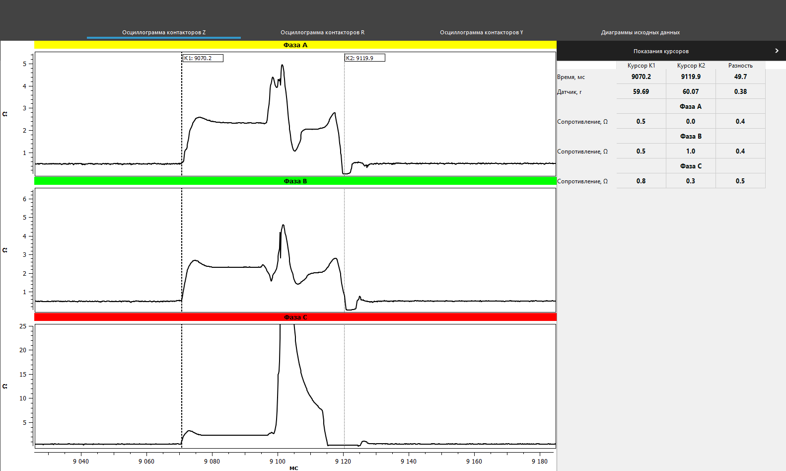 It is important to mention that circular diagram registration and oscillography for resistor devices made with an PKR group instrument is realized in one measurement, that significantly reduces the time for diagnostic.