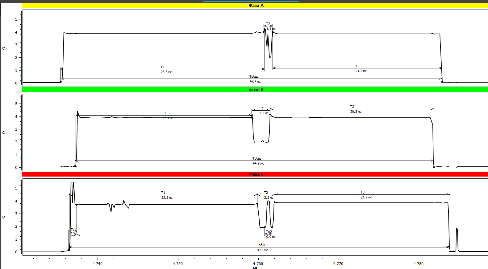 After receiving a complete oscillogram registered in DRM mode, the user has the opportunity to view each peak at all stages of an OLTC by scaling, both on the screen of the instrument of PKR group and on the computer/laptop screen (hereinafter - PC) in a special software. Even such an express analysis will already allow us to determine possible incipient defects and malfunctions of the contactor (Fig. 2 and Fig. 3).