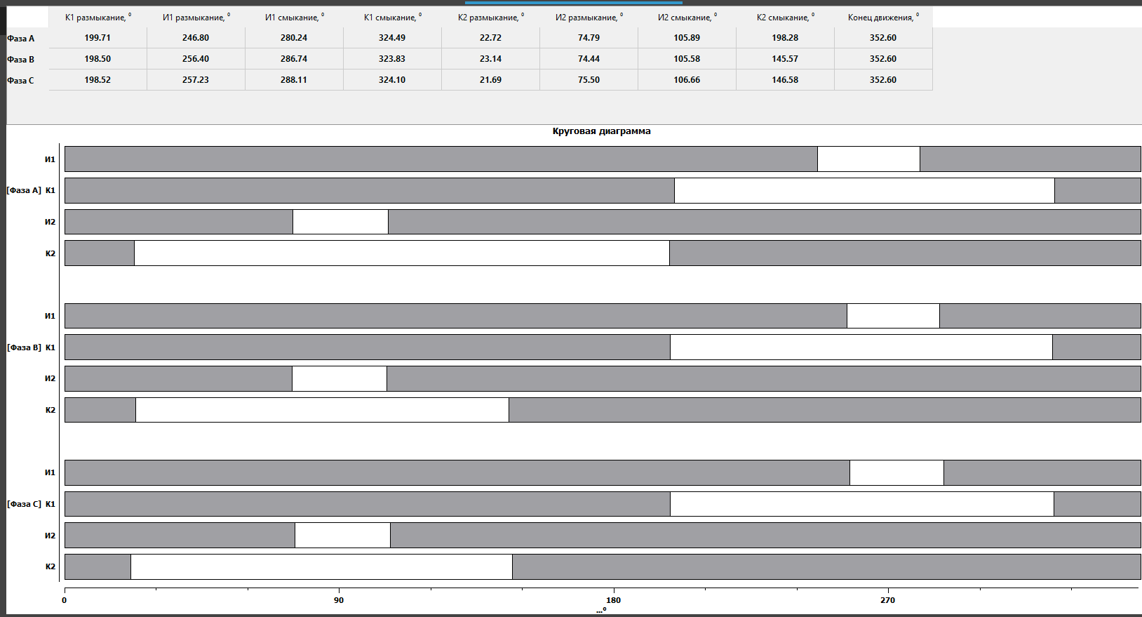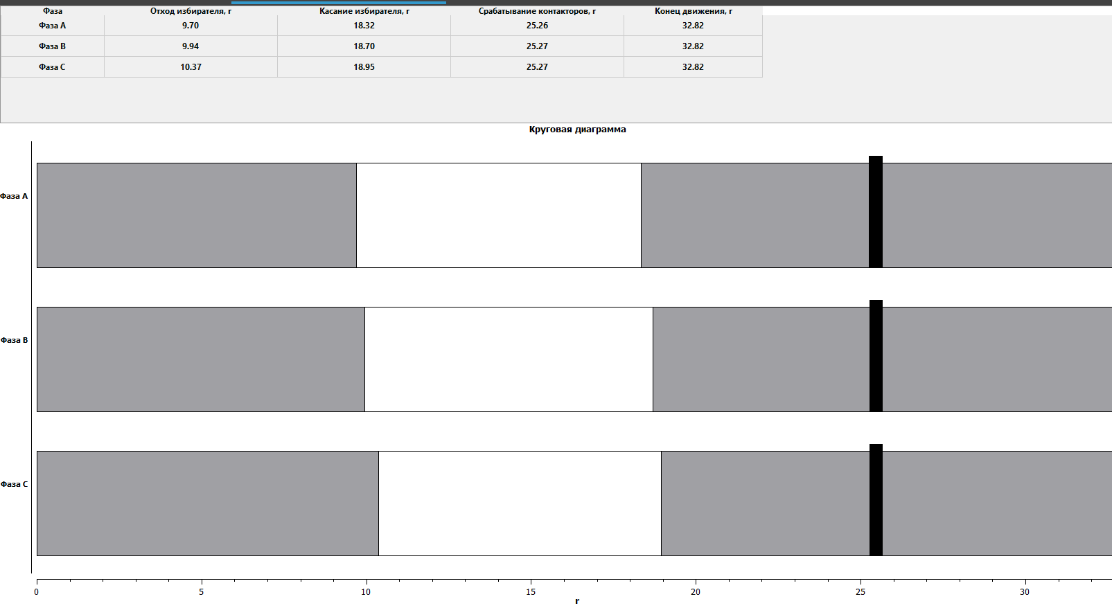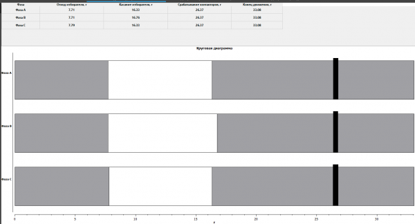 Diagnostic using circular diagrams allows you to see the entire process of switching an OLTC and assess its condition by determining the operation backlashes. According to the results, the operation of the main nodes and their sequence of actions, angular values for all phases and possible defects that can be seen with the unaided eye are clearly shown on the display of the PKR group device or in the software on the PC. Switching over all three phases should be synchronized, so that the slightest shifts and differences are immediately visible (Fig. 7).