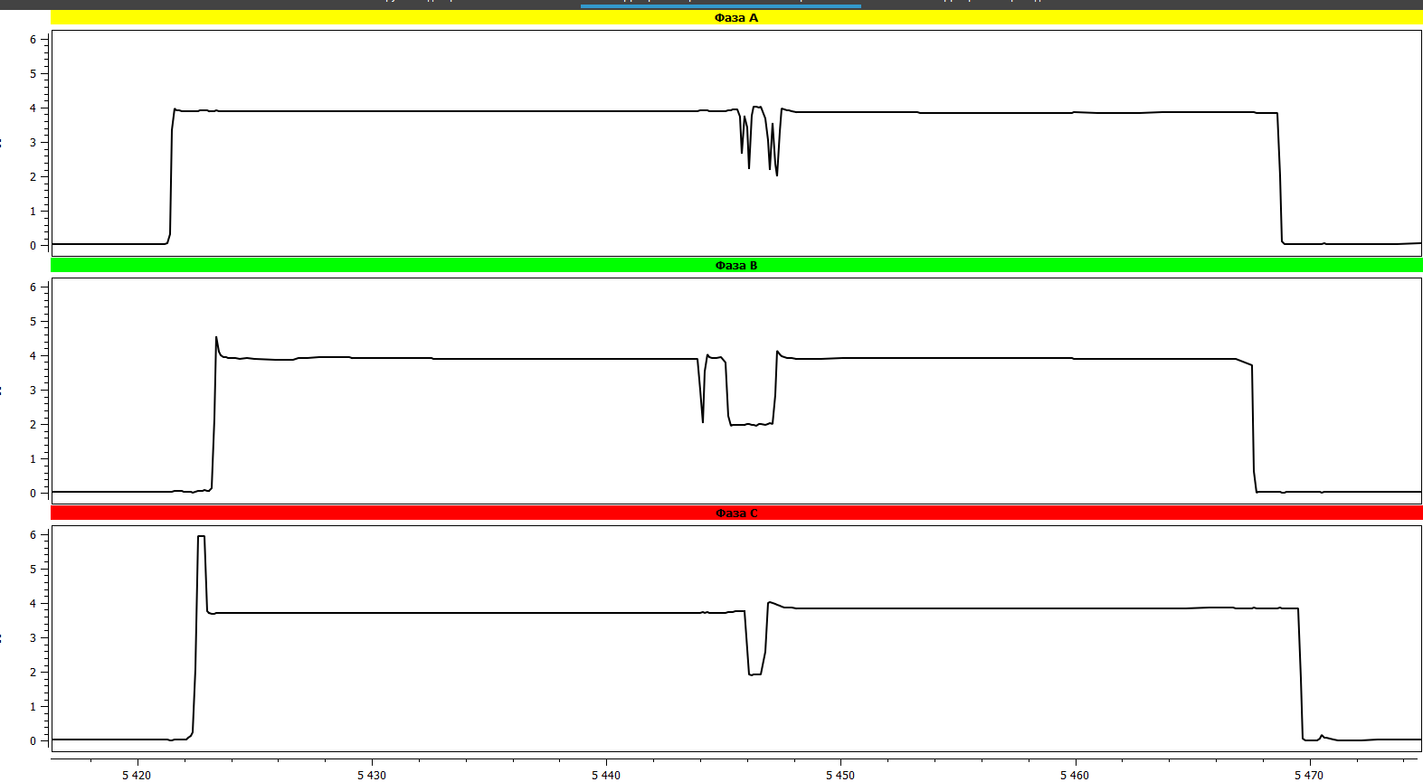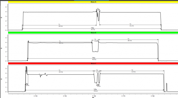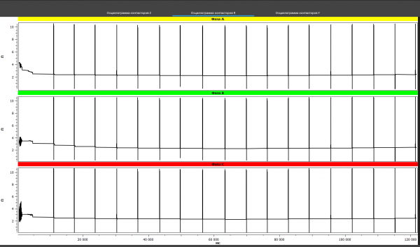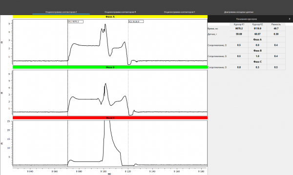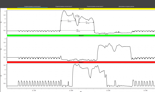 The results of oscillography made with the PKR group instruments are presented in the figures below (Fig. 10). In this case, on the oscillograms the bounce were noted in phases A and C, which were repeated at several taps, that may indicate a defect in the contactor contacts, and most often this is the contact burns.